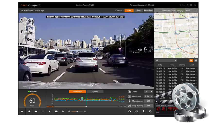フロントとリアのカメラ映像を見ながら、車の速度、位置、経路履歴などのGPSデータを簡単に確認できます。